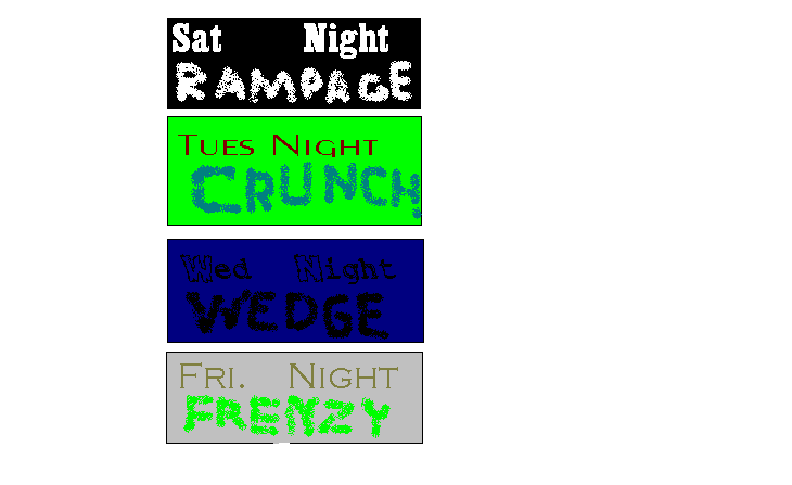 #2. No sending junk mail like You Suck, or ha, ha you lost, none of that and if you have that done to you report it to me and I will have that person suspended. There is 4 cards a week. Tues Night Crunch, Wed Night Wedge, Fri Night Frenzi, and Sat Night Rampage.